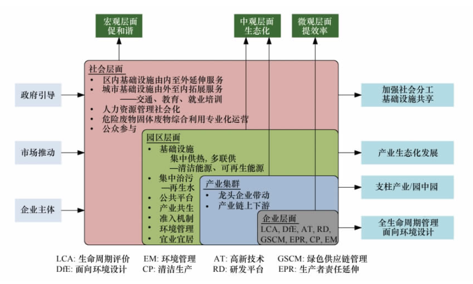 我國實(shí)施可持續(xù)發(fā)展戰(zhàn)略要求發(fā)展生態(tài)工業(yè),打破“綠色壁壘”也需要工業(yè)的生態(tài)化發(fā)展,可以說,生態(tài)工業(yè)是我國工業(yè)發(fā)展的必然選擇。生態(tài)工業(yè)理念被引入中國后,原國家環(huán)??偩钟?000年開始推動(dòng)生態(tài)工業(yè)園區(qū)建設(shè),發(fā)展過程中逐步形成了“有標(biāo)準(zhǔn)可依,依標(biāo)準(zhǔn)建設(shè),據(jù)標(biāo)準(zhǔn)考核,示范試點(diǎn)帶動(dòng),建立長(zhǎng)效機(jī)制”的發(fā)展路線圖。鑒于開發(fā)區(qū)面臨的嚴(yán)峻環(huán)境保護(hù)形勢(shì),國家稅收政策調(diào)整、資源和能源緊缺、環(huán)保標(biāo)準(zhǔn)提高等伴隨的發(fā)展壓力,以及節(jié)能減排科技需求,2007年環(huán)保部、商務(wù)部、科技部聯(lián)合,加強(qiáng)對(duì)國家生態(tài)工業(yè)示范園區(qū)建設(shè)的推進(jìn)。生態(tài)工業(yè)示范園區(qū)是依據(jù)清潔生產(chǎn)要求、循環(huán)經(jīng)濟(jì)理念和工業(yè)生態(tài)學(xué)原理而設(shè)計(jì)建立的一種新型工業(yè)園區(qū)。它通過物流或能流傳遞等方式把不同工廠或企業(yè)連接起來,形成共享資源和互換副產(chǎn)品的產(chǎn)業(yè)共生組合,使一家工廠的廢棄物或副產(chǎn)品成為另一家工廠的原料或能源,模擬自然系統(tǒng),在產(chǎn)業(yè)系統(tǒng)中建立“生產(chǎn)者—消費(fèi)者—分解者”的循環(huán)途徑,尋求物質(zhì)閉環(huán)循環(huán)、能量多級(jí)利用和廢物產(chǎn)生最小化。