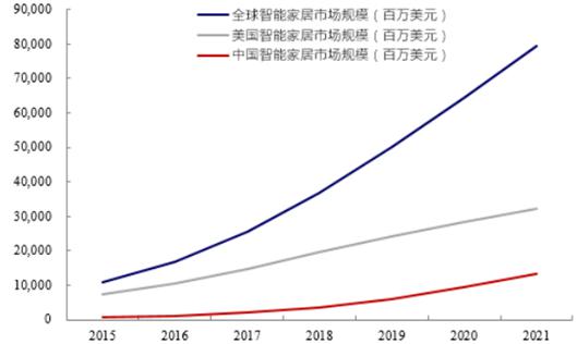 近年來智能家居市場進(jìn)入快速拓展期,用戶滲透率快速增長。根據(jù)調(diào)查數(shù)據(jù)顯示,2017 年美國智能家居市場規(guī)模將達(dá) 146 億美元,滲透率提升至 32.5%,預(yù)計(jì) 2021 年將達(dá)到 60.7%。而中國智能家居市場規(guī)模也超過 20 億美元, 滲透率為 2.6%,與美國相比差距較大,未來發(fā)展空間廣闊。隨著語音識(shí)別技術(shù)不 斷成熟,智能音箱作為語音交互載體,在控制智能家居的便捷度和體驗(yàn)上都將逐 步優(yōu)于智能手機(jī)。未來智能音箱有望成為智能家居的控制中樞,成為一個(gè)開放性的平臺(tái),可以讓客廳的智能電視、電燈、空調(diào)等鏈接起來,通過語音交互來實(shí)現(xiàn)對(duì)于其他智能家居產(chǎn)品的控制,掌握了智能音箱便掌握了智能家居的入口。