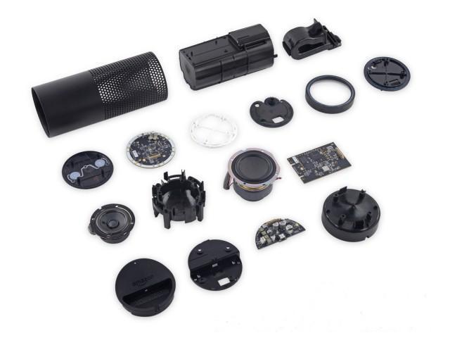 下圖展示了 Echo 拆解后的部件??梢钥吹?,智能音箱的硬件并不算復(fù)雜(相對(duì)于無人駕駛等“重型”AI 產(chǎn)品)。