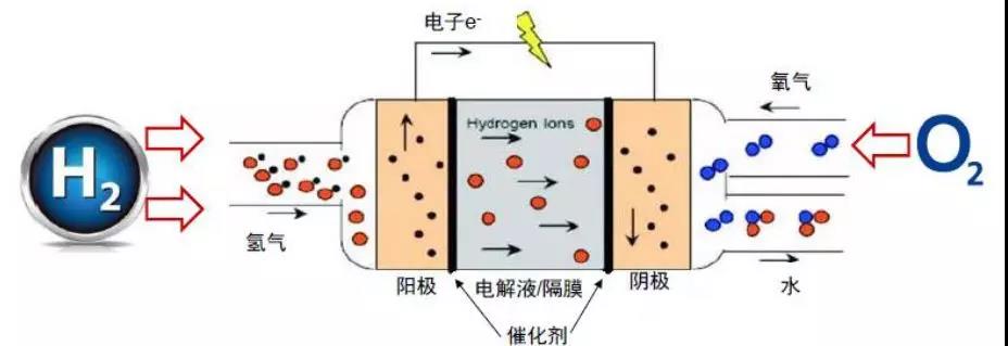 其工作原理是H2在陽極催化劑作用下被氧化成H+和e-,H+通過質(zhì)子交換膜達到政正極,與O2在陰極反應(yīng)生成水,e-通過外電路達到陰極,連續(xù)不斷的反應(yīng)就產(chǎn)生了電流。燃料電池雖帶有“電池”二字,卻不是傳統(tǒng)意義上的儲能設(shè)備,而是一種發(fā)電設(shè)備,這是燃料電池與傳統(tǒng)電池最大的區(qū)別。